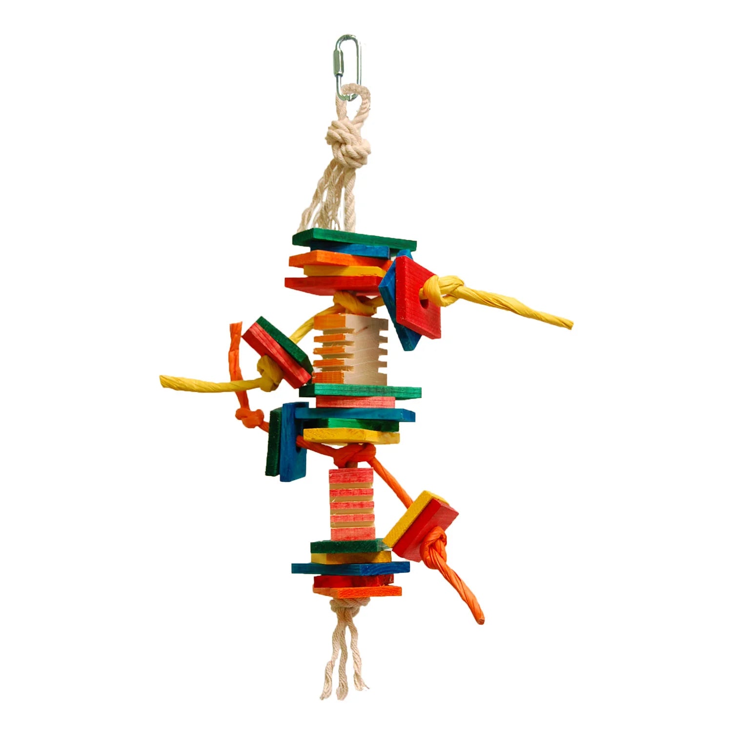 The Coleop Small - Zoo Max bird toy measures 16" x 4" and combines natural paper and cotton ropes with soft wood components, including groovy wood blocks and shredded cardboard pieces. Designed to engage your bird’s chewing instincts, it offers varied textures and shapes to promote mental stimulation and prevent boredom. Each toy’s wood parts and colors vary, ensuring a unique and enriching experience for your pet. Made with safe, natural materials to support your bird’s healthy playtime.