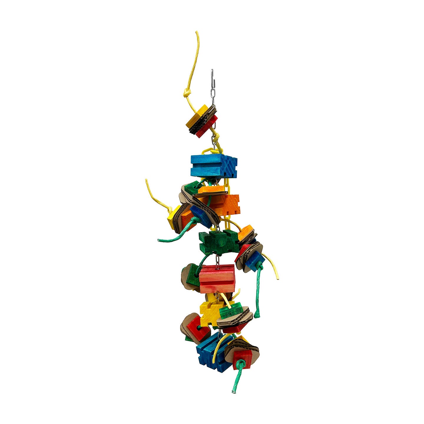 The Helice from Zoo Max is a large-scale toy measuring 26" x 10" that features substantial wood pieces assembled on a durable welded chain. The combination of chunky wood components, plastic chain segments, and cardboard elements creates multiple textures for birds to explore and destroy. This multi-material design encourages natural foraging and chewing behaviors while the robust construction supports active play. Ideal for medium to large parrots seeking substantial enrichment, the Helice delivers long-lasting engagement through varied tactile experiences and destructible elements.