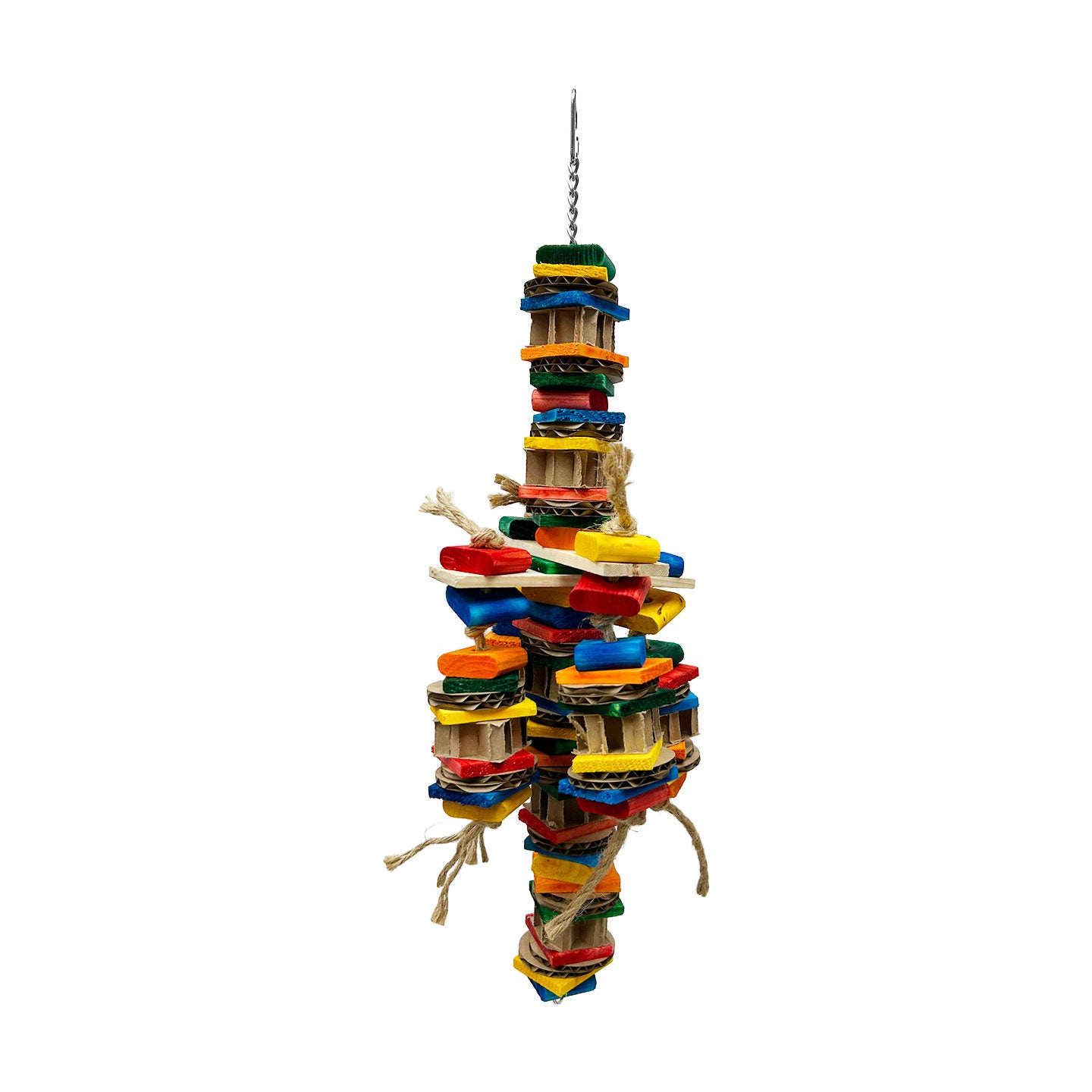 Picolo Medium offers engaging enrichment for medium parrots who thrive on destructive play. Measuring 20″x7″, this chain-assembled toy features pine wood construction with multiple cardboard pieces of varying shapes—ideal for shredding and foraging. The layered cardboard elements provide satisfying textures and encourage natural chewing behaviors while keeping your bird mentally stimulated and physically active. Perfect for birds that love to destroy.