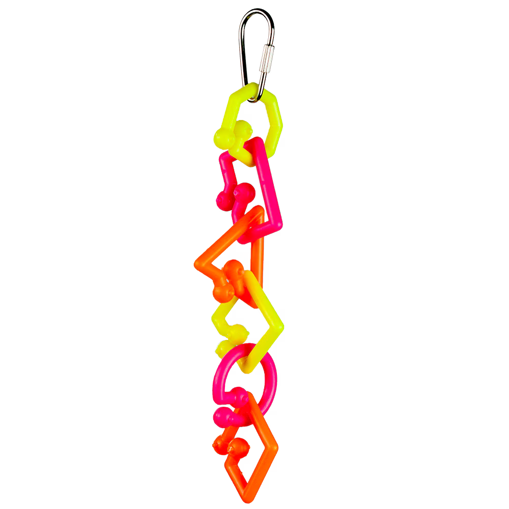 Silly Links Small is a compact bird toy measuring 1.5" x 1.5" x 7", designed to engage your bird’s curiosity and encourage active play. Its size makes it ideal for smaller birds, promoting mental stimulation and physical activity while fitting securely in various cage setups. Crafted to be safe and durable, it supports your bird’s well-being through interactive fun.